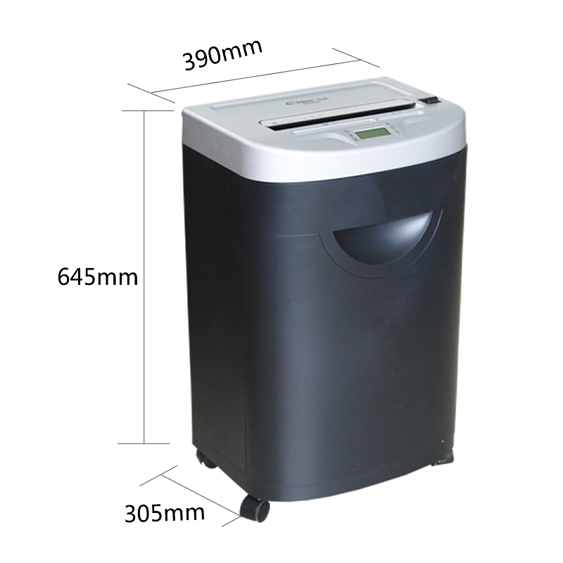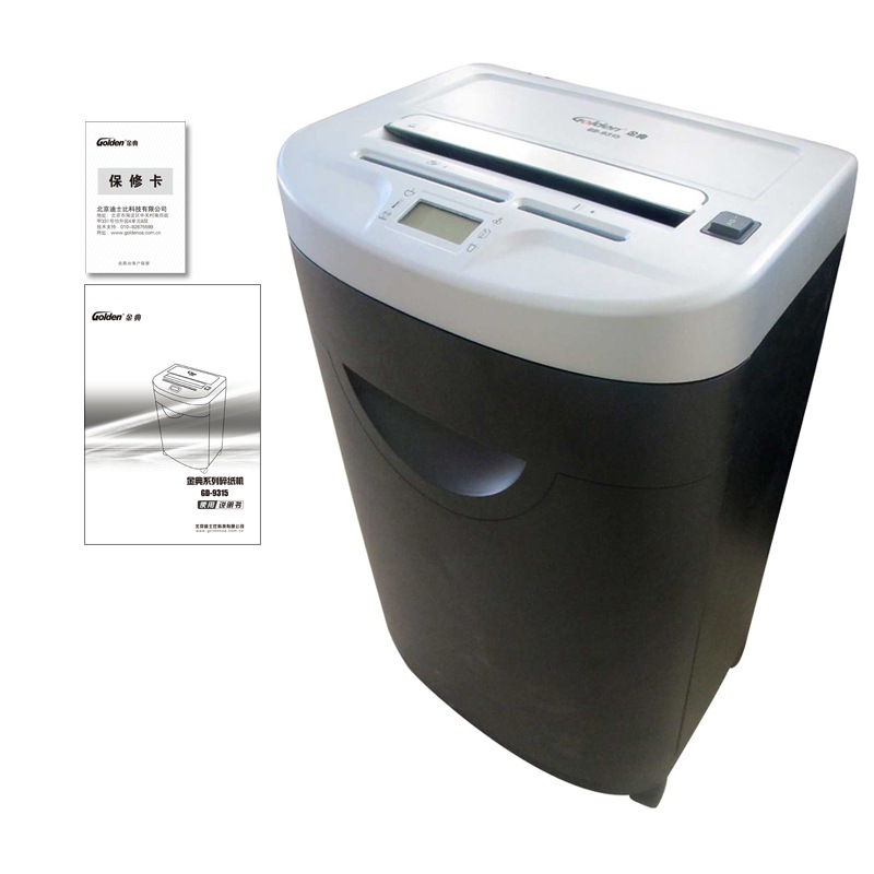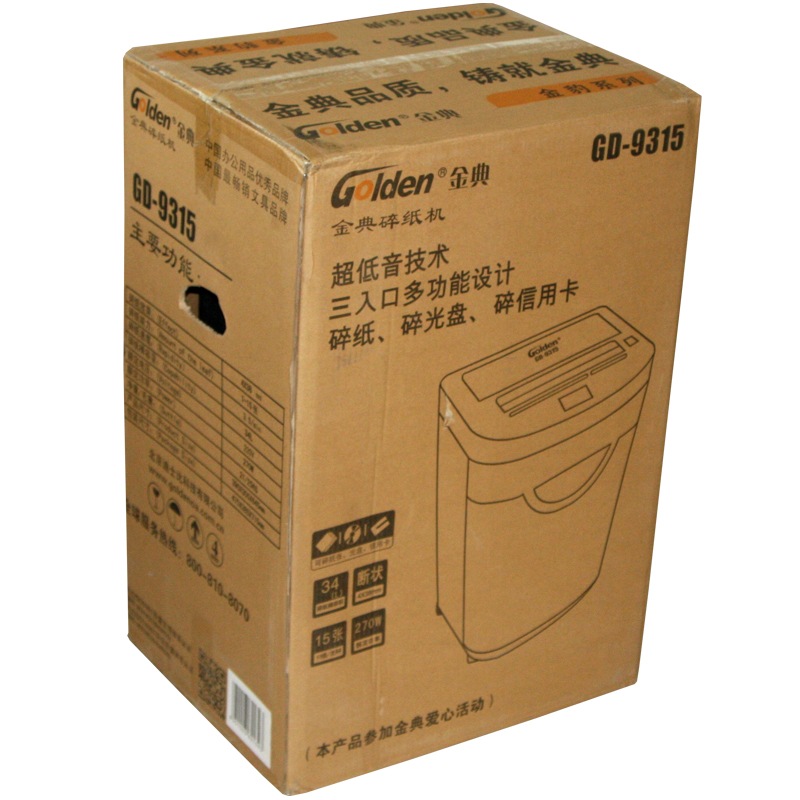 商品重量 [商品重量] 25kg [编码] 2.13.01.05.09.002.00007 [最大碎纸量] 碎纸张数15张 [噪音] <58db [切碎介质] 纸、信用卡、CD [类别] 金鹰系列 [容量] 碎纸效果4*38mm,三入口宽度230mm,双入口,34L容量 [型号] GD-9315 [单位] 台