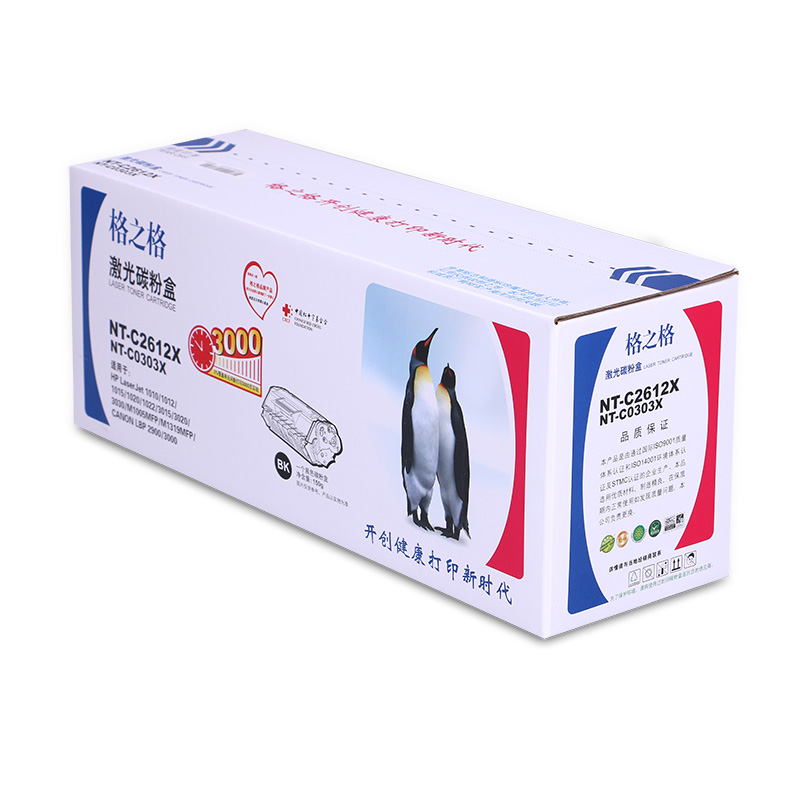 商品属性 [商品重量] 0.91kg [类目名称] 格之格 NT-C2612X硒鼓 鼓粉一体 含粉量150g 打印页数2500页 [型号] NT-C2612X [颜色] 黑色 [适用机型] HP LaserJet 1010/1012/1015/1020/3015/3020/3030/ HP LaserJet M1005/3052 CANON LBP-2900/3000 HP LaserJet M1319f [编码] 2.14.01.02.05.001.00001