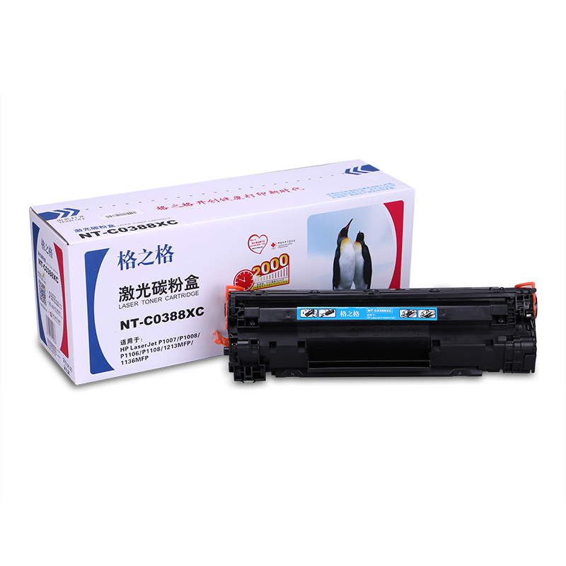 商品属性 [商品重量] 1.003kg [类目名称] 格之格 NT-C0388XC硒鼓 鼓粉一体 含粉量100g 打印页数2000页 [颜色] 黑色 [适用机型] HP惠普 P1007/P1008/M1136/M1213nf/M1216nfh/P1106 P1108 [编码] 2.14.01.02.05.001.00004 [型号] NT-C0388XC