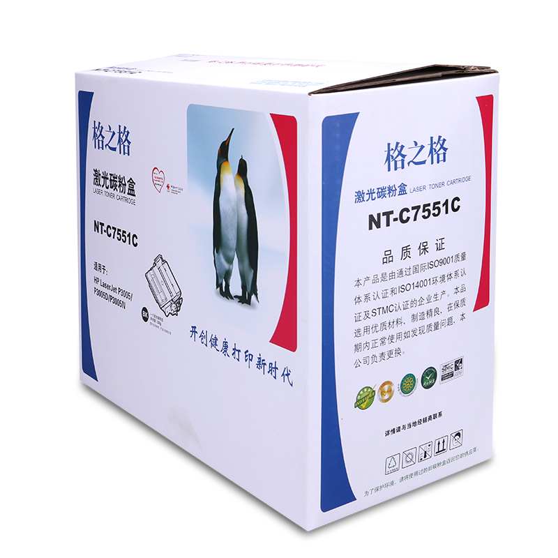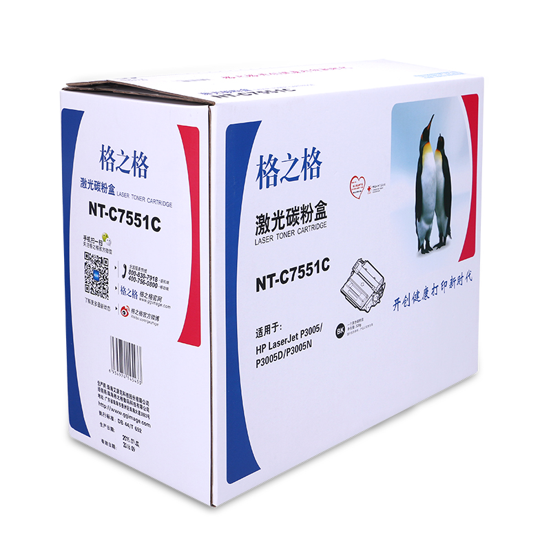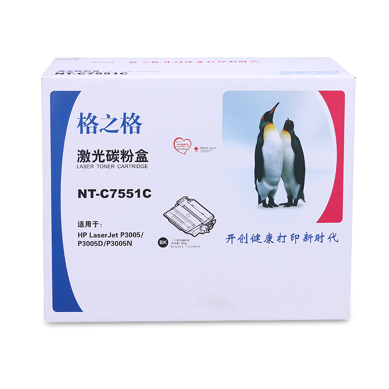商品属性 [商品重量] 2.316kg [类目名称] 格之格 NT-C7551C硒鼓 鼓粉一体 含粉量320g 打印页数6500页 [型号] NT-C7551C [颜色] 黑色 [适用机型] HP Laserjet P3005/P3005d/P3005N [编码] 2.14.01.02.05.001.00020