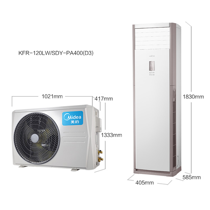 商品属性 [商品重量] 191kg [型号] KFR-120LW/SDY-PA400(D3) [颜色] 白色 [类别] 立柜式 [制冷类型] 冷暖 [匹数] 5匹 [定频/变频] 定频 [能效等级] 3级 [电辅加热] 3500W [适用面积(平方米)] 41m^2 (含)-60m^2 (含) [制冷量(W)] 12000W [制冷功率(W)] 3896W [制热量(W)] 13500W [制热功率(W)] 3960W [电辅加热功率(W)] 3500W [内机噪音(dB(A)] 52dB [外机噪音(dB(A)] 58dB [循环风量(m3/h)] 2000m3/h [扫风方式] 上下/左右扫风 [自动清洁] 支持 [制冷剂] 氟利昂(R22) [电压/频率(V/HZ)] 380/50 [内机尺寸(宽x高x深)mm] 1830x585x405mm [外机尺寸(宽x高x深)mm] 1021x417x1333mm [内机重量(kg)] 75kg [外机重量(kg)] 116kg [编码] 2.14.01.05.01.001.00041