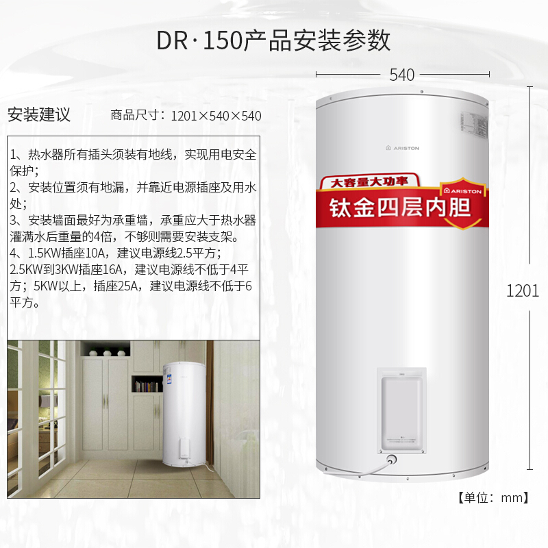 阿里斯顿(ARISTON)电热水器 150升 DR150130DJB 3000W加热 钛金四层胆 含安装调试